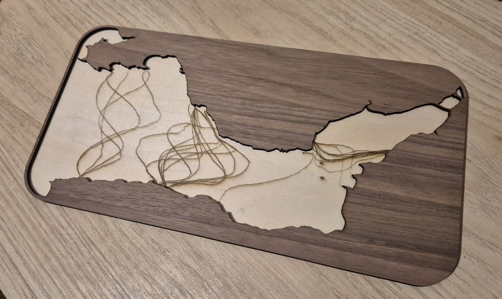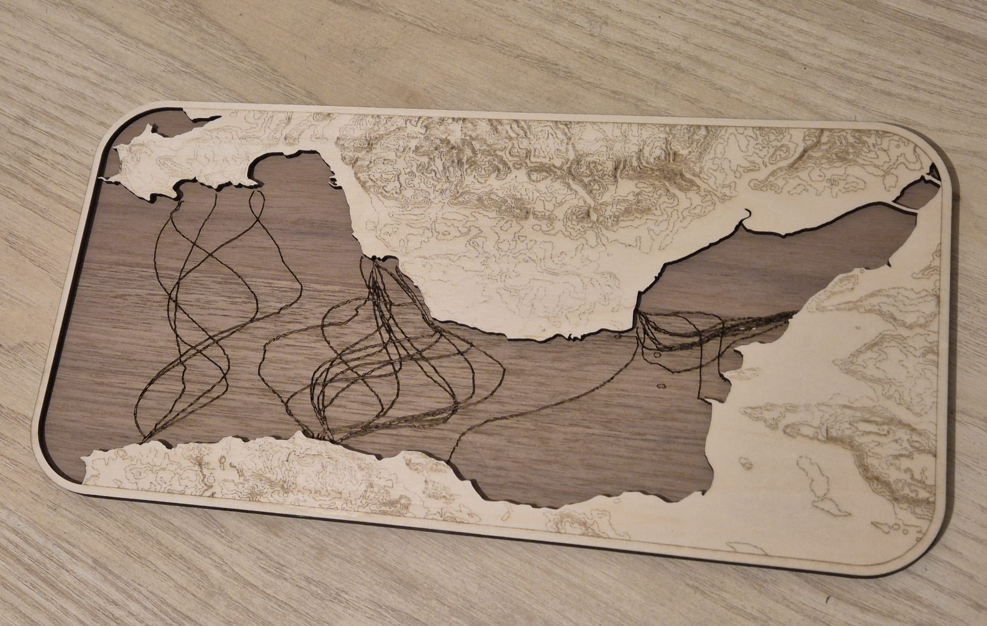 Simple Bristol Channel map, approx 12″ x 6″ in maple on walnut.